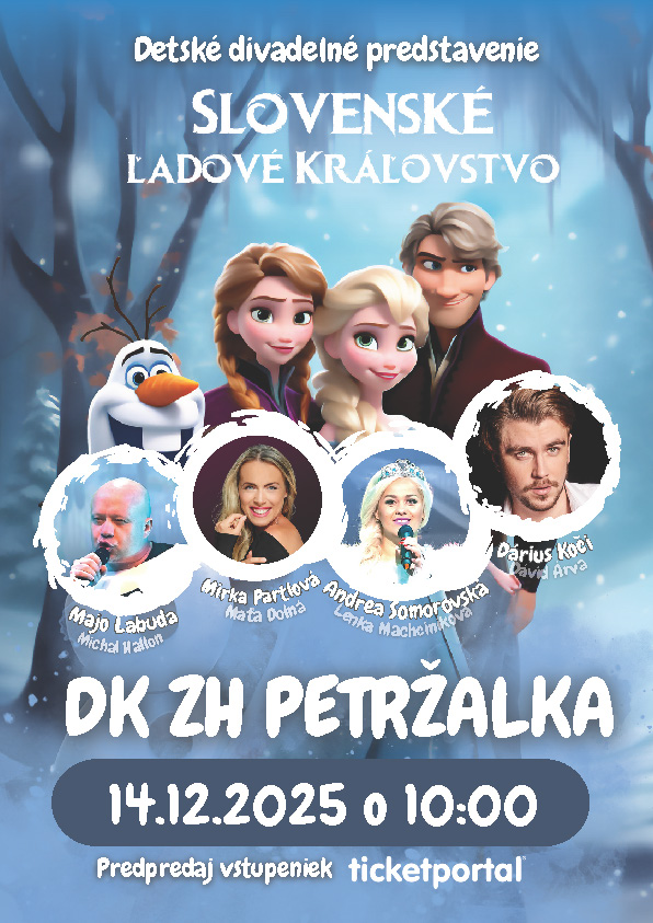 Divadelné muzikálové predstavenie, na motív jednej z najznámejších rozprávok všetkých čias, je plné humoru a ikonických piesní, ktoré potešia divákov všetkých vekových kategórií. Zavrite oči a nechajte sa preniesť do krajiny Arendelle. Čaká na vás príbeh o skrytých silách kráľovnej Elzy, ktoré uvrhnú krajinu Arendelle do večnej zimy a jej sestre Anne, ktorá sa ju vydá nájsť a zachrániť kráľovstvo skôr, než bude príliš neskoro. Obe sestry sa naučia, že iba skutok pravej lásky môže rozmraziť zamrznuté srdce. Cestou tohto dobrodružstva ich budú sprevádzať milý a vtipný snehuliak Olaf a nebojácny a odvážny dobrodruh Kristoff, s jeho verným spoločníkom sobom Svenom. Cestu im však skríži aj princ Hans, ktorý sa pokúsi lsťou získať kráľovstvo Arrendele. Získa ho? Nuž uvidíme.