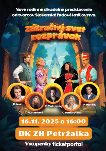 Zázračný svet rozprávok je nové divadelné predstavenie od tvorcov muzikálového predstavenia Slovenské ľadové kráľovstvo. Vitajte v Zázračnom svete rozprávok, kde nič nie je nemožné. Pripravte sa na nezabudnuteľné divadelné predstavenie, ktoré zabaví a roztancuje malých aj veľkých! Čaká vás explózia najznámejších hitov z najobľúbenejších rozprávok súčasnosti s obľúbenými hrdinami, ktorých sprevádza samotný Džin z rozprávky Aladdin. V našej čarovnej krajine, kde sa prelínajú hranice rôznych rozprávkových svetov, fantázia nepozná obmedzenia. Príďte sa na vlastne oči presvedčiť, že vďaka priateľstvu a odvahe, dokážu všetci hrdinovia príbehu prekonať všetky prekážky a nájsť svoje šťastie.