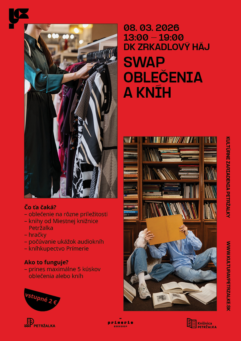 Pri príležitosti Mesiaca kníh a Týždňa slovenských knižníc (3.–9. 3.) spájame swap oblečenia so swapom kníh v spolupráci s Miestnou knižnicou Petržalka.
